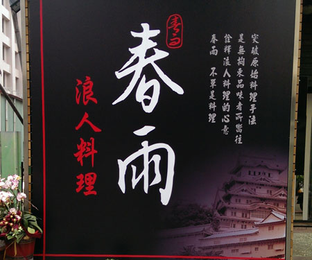我們本來要去大墩十二街吃一家泰式料理的,路上經過這家「浪人料理」,menu就放在門口,我們停下來看了一下,店內有人出來介紹,聽了也滿感興趣的,結果泰式餐廳客滿,就回來吃這家,所以說店員出來街上拉客還是有用的。旁邊就是一個收費停車場,一小時30元,厚切豬排海報看起來很誘人,一般連鎖豬排店應該沒這厚度,另一邊的秘醬豬排海報也很誘人,好難選擇,這是料理東西軍嗎,地址在大昌街431號,住宅區的巷弄中,老闆說他們希望營造出像日本巷弄裡小食堂的感覺...巷弄裡的小驚喜【春雨浪人料理】