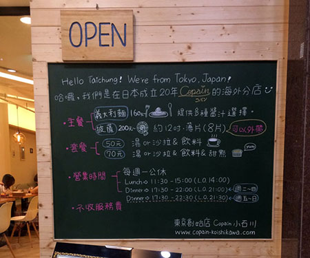 這家店是一個朋友推薦的,她說這家義大利麵很好吃,我搬來台中後還沒吃過好吃的義大利麵,每每失望後變得很沮喪,想說那就來試試看吧,我們這天是來吃中餐,吃完以後...當天又來吃晚餐了 這應該是史上第一次,因為太好吃,晚上又來吃的案例,異常對我們的胃口,我很久以前就聽過Copain,說也是排隊排的很誇張,但我們來的這家都沒人排隊,就在台中新時代百貨旁的巷子裡,地址是台中市東區大勇街28號,電話是04-2220-0698,每週一公休,自從發現這家Copain二號店以後,我已數不清來過幾次,而且只要想吃義大利麵,他們家就是台中首選 我沒吃過一店,不知道口味和服務如何,但這家2號店實在很好吃,跟我們一起去吃的朋友每個都說好吃,而且拜託我不要寫出來,不然以後去就要排隊了,但身為一個美食部落客,偶爾也要揭露一些私藏美食造福讀者,如果你喜歡吃義大利麵,來這家Copain就對了 Copain創始店在日本東京,所以是日式風味的義大利麵,我去日本這麼多次,因為拉麵的排他效應,我很少在當地吃義大利麵,但我猜Copain的口感應該相差不遠,而且就在新時代旁邊,停車超級方便,又免費,只要辦張新時代會員卡,免消費,只要亮卡就可無限停車,爽!...祕密好店【Copain義式廚房】2號店