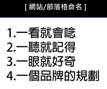 「如何取部落格名稱?」我以前的課是有這張簡報的,後來我覺得這事其實很簡單啊,當我把課程升級成【部落客MBA】等級後,這類比較基礎的內容就被我捨棄了。越來越多人想寫部落格,且多不是網路人,上完我的課後想開始入門,但面臨的第一個問題就是「取名稱」,好的部落格名稱當然很重要,既然我課堂上不再教,我就利用這篇文章把他一次說清楚吧 第一個大原則,寫部落格的最終目的是建立個人品牌,還有什麼名稱會比您的「真實本名」來的好呢?你看看現在市面上任何名人,包括藝人(周杰倫、劉德華)、政客(陳水扁、馬英九)、企業老闆(郭台銘、張忠謀),八成都是用「名字」,不管是本名或是藝名,他的品牌就是一個「名字」。你可以直接叫本名,例如朱學桓、李昆霖、彭明輝、楊斯棓等部落客,或利用其中一個字延伸出去,例如我的網址是 WendellYu.com,是我從1996年開始做網站時就用的,舊版部落格名稱叫做「我就是強」,因為我的本名是于文強,兩年多前我改名為于為暢,所以網站同更名為「天下為暢」,我為人處事光明正大,永遠忠實的做自己,所以我網站名稱根本不用花什麼時間去想,直接跟本名有關就好,啊我們不就是要打響個人品牌嗎?何不投直球就好,繞什麼路呢?